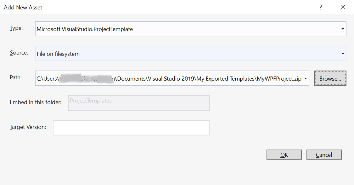 To add the Visual Studio project template, open the source.extension.vsmanifest file, then select Assets, and click New. The Add New Asset dialog will appear. Provide the template details as illustrated in the following screenshot.