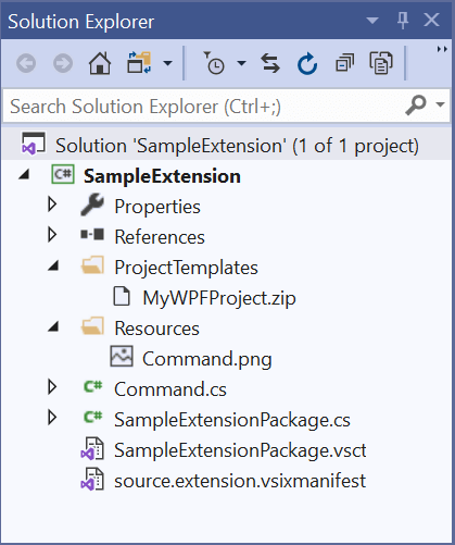 Name the file Command and click Add. The Command.cs, Command.png under the Resource folder, and SampleExtensionPackage.vsct files will be created and added to the project.