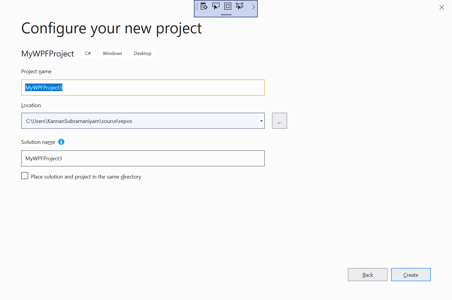 When selecting the Create MyWPFProject, the Configure your new project dialog will appear as shown in the following screenshot.