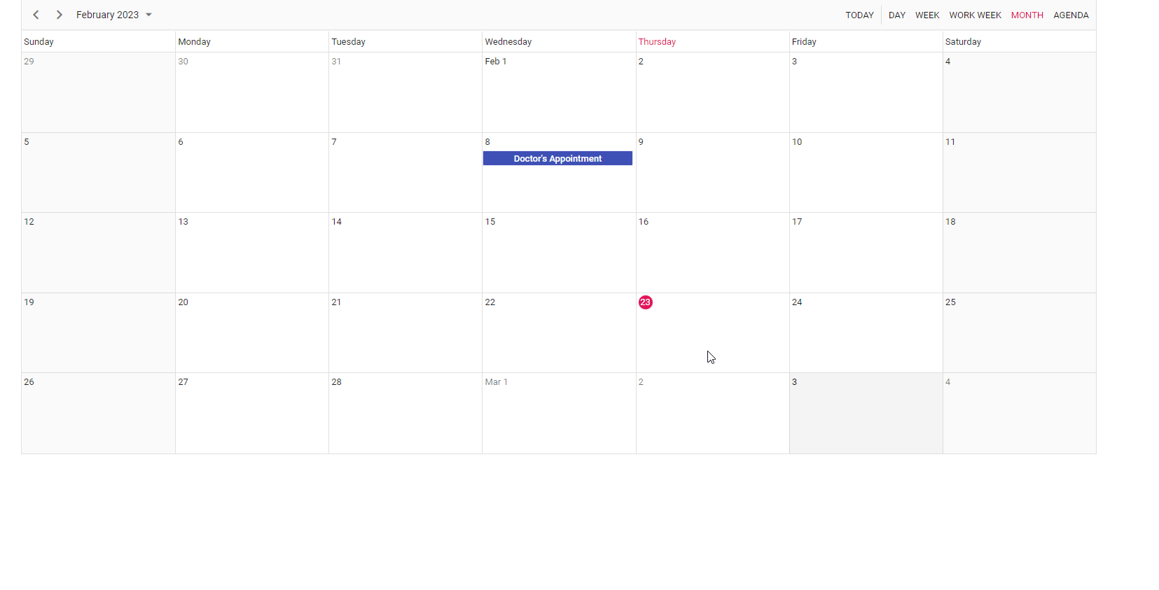 Delete action: When you double-click an event, the default editor window will open. This window includes a Delete button at the bottom left to allow you to delete that appointment. When deleting an appointment through this editor window, the delete alert confirmation will not be displayed, and the event will be deleted immediately. Also, you can select an appointment and press the Delete key to delete the appointment.