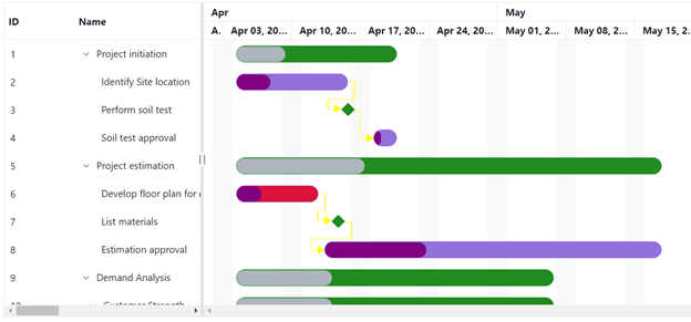 The Blazor Gantt Chart is a project planning and management tool that provides a Microsoft Project-like interface to display and manage hierarchical tasks with timeline details. Its intuitive user interface lets you visually manage tasks, resources, and task relationships in a project.