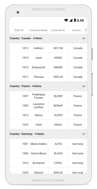 Data grouped with respect to Country in Data Grid