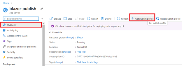 - Navigate to the overview section, click on Get publish profile, and save the profile locally.