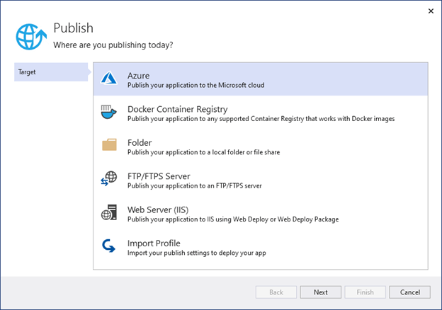 - Select Azure as the target and Azure App Service (Windows) as the specific target.