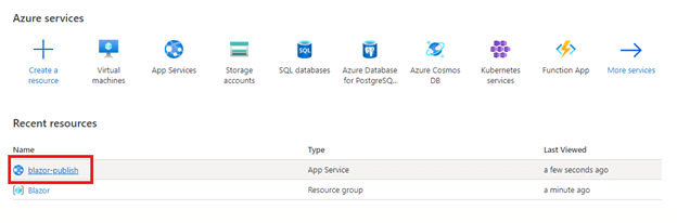 - After configuring the Web App service, get the publish profile for the Web App service to host the Blazor application. Select the created web app service (blazor-publish).