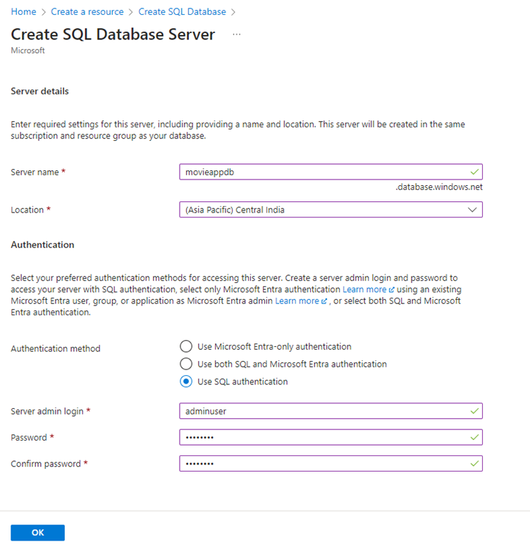 - Server name: Choose a unique server name (e.g., movieappdb). Ensure that server names must be globally unique across all Azure servers.