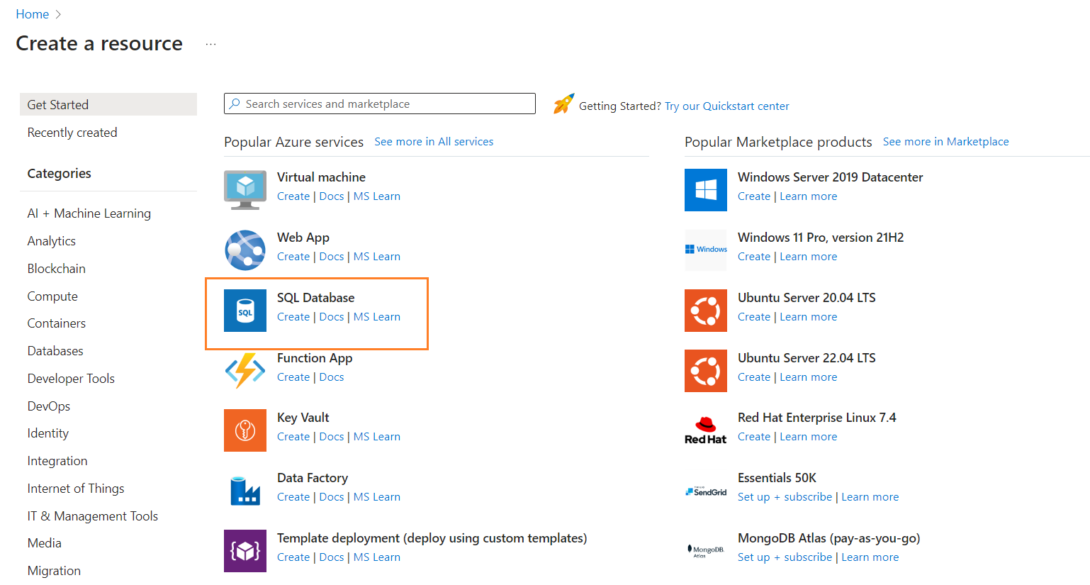 - Locate the SQL Database resource and click Create. Refer to the following image.
