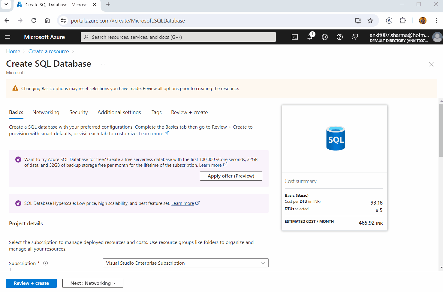 - Finally, click Create at the bottom of this tab to initiate the creation of your SQL database. Refer to the following image.