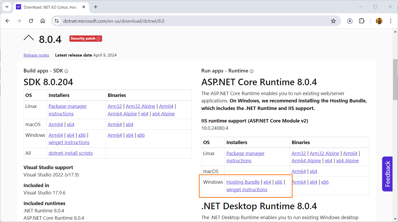 To power your app with the .NET Runtime and IIS support, you’ll need the .NET Core Hosting Bundle. First, navigate to the .NET downloads page and click on the latest stable version of .NET. For our app, we are using .NET 8.0, so select that option.