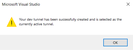 - Click OK to create the Dev Tunnel. You will get the following pop-up window once the Dev tunnel is successfully created.