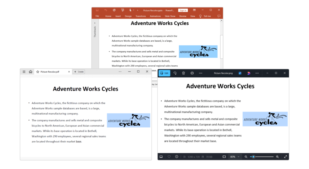 - Color transformation for images: Recolored images are now accurately preserved in PowerPoint-to-PDF and image conversions, maintaining the visual appearance of custom-colored graphics and logos for clear branding.