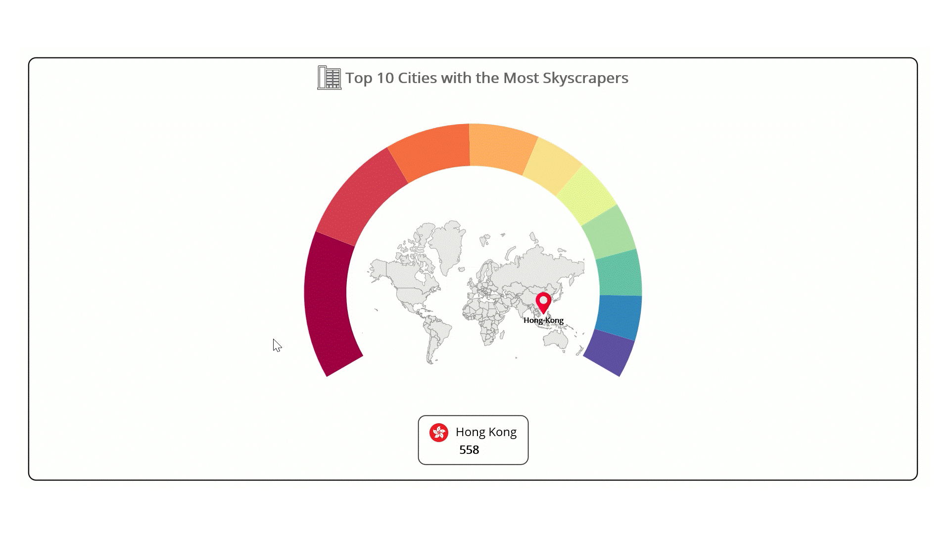 Refer to the following code example. Here, we’ll highlight the major cities with the most skyscrapers by placing a custom marker on the map when a chart segment explodes. Additionally, we’ll display the corresponding country name and the skyscraper count in the bottom area of the chart.