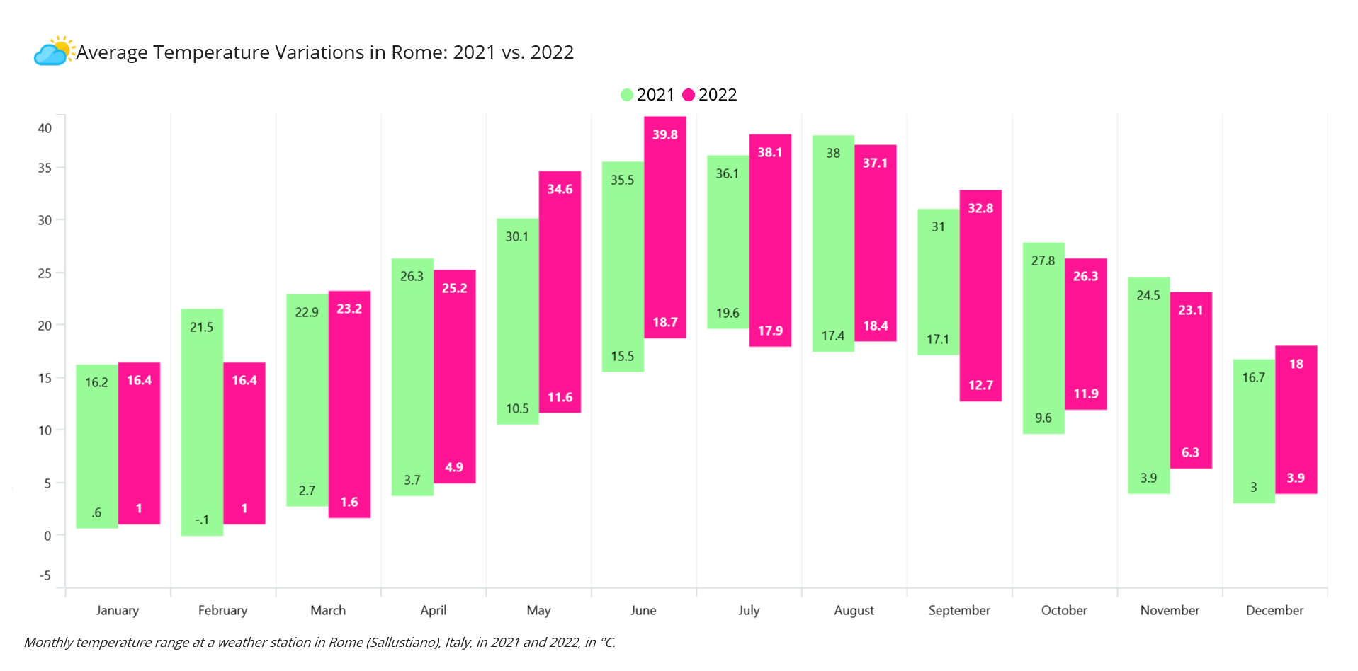 Text="Monthly temperature range at a weather station in Rome (Sallustiano), Italy, in 2021 and 2022, in °C.">