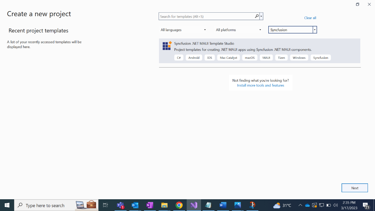 - Choose the Syncfusion .NET MAUI Template Studio option from the search results and then proceed by clicking Next.