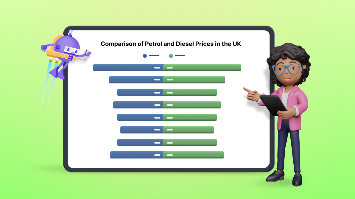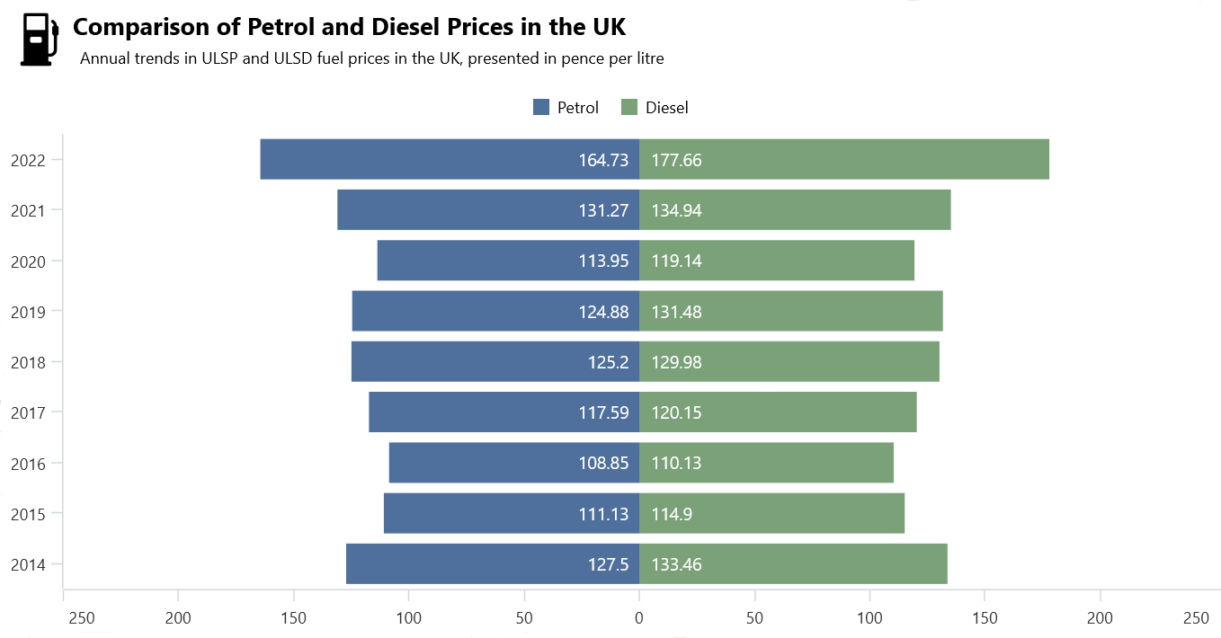 We’ll compare the annual prices of ULSP (ultra-low sulfur petrol) and ULSD (ultra-low sulfur diesel) in the United Kingdom using a tornado chart that resembles a butterfly graph. It will allow us to identify and compare petrol and diesel prices easily.