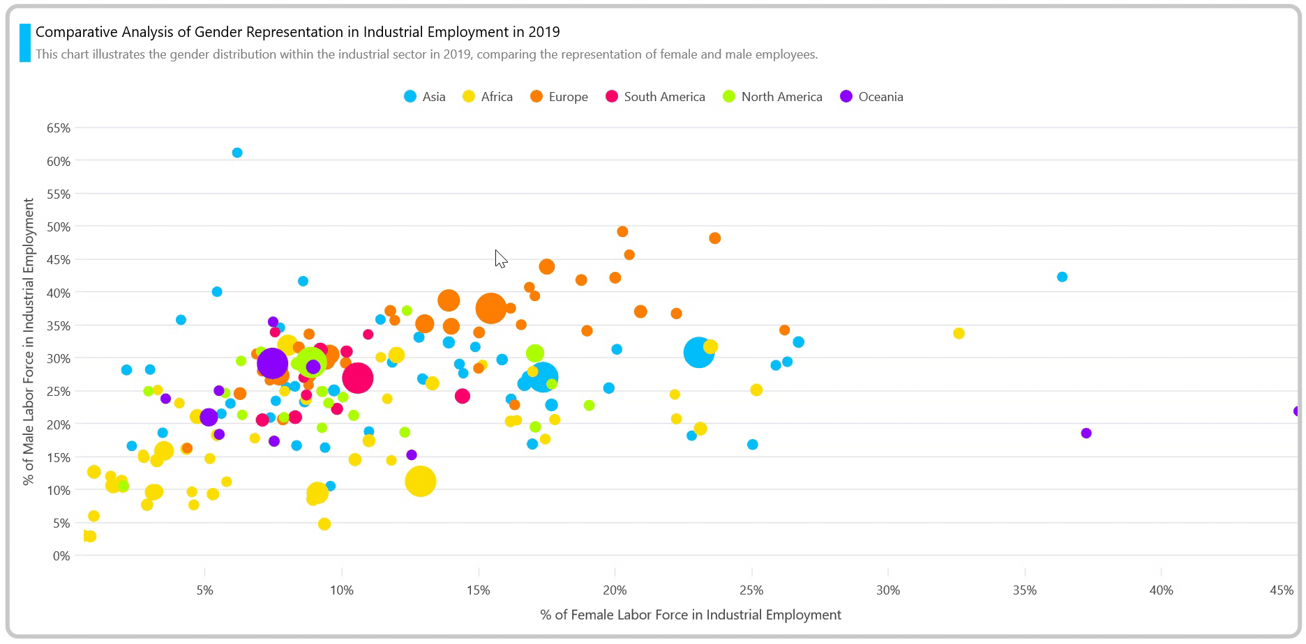 This week’s edition will examine the gender distribution in industrial employment for 2019. This visualization will illustrate the contributions of males and females in the industrial sector across various countries based on their continents, highlighting the balance and diversity within the workforce.