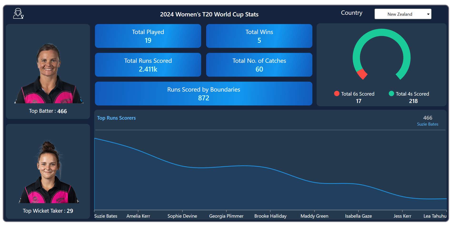- Batter: Represents the top run count data from the team on a country-wise basis.