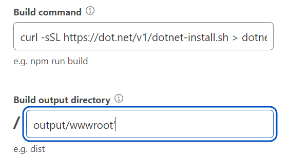 - On the next page, fill in the Project name text box. The project name will be the name for your hosted link. Then, under the Build Settings, fill in the Build Command text box with the following commands and the Build output directory text box with output/wwwroot. Click Save and Deploy.
