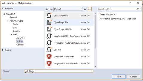 Choose the scripts option (Installed -> Visual C# -> ASP.NET Core -> Web -> Scripts), set file name as js, and add it.
