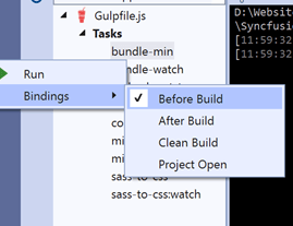 - Before Build: The binding tasks will run before building our app. We can add the following tasks to this: “clean-bundle,” “sass-to-css,” “bundle-min.”