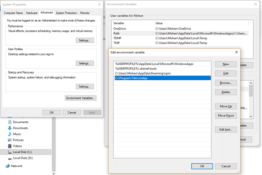 After installing Node.js, set its installed location as a path in an environment variable. To do so, open Run (Win + R) and execute “rundll32 sysdm.cpl,EditEnvironmentVariables”. This will open the environment variables dialog, in that open path by performing a double-click on the path. In the Edit environment variable dialog, click New and add the installed location of Node.js, which by default is C:\Program Files\nodejs.