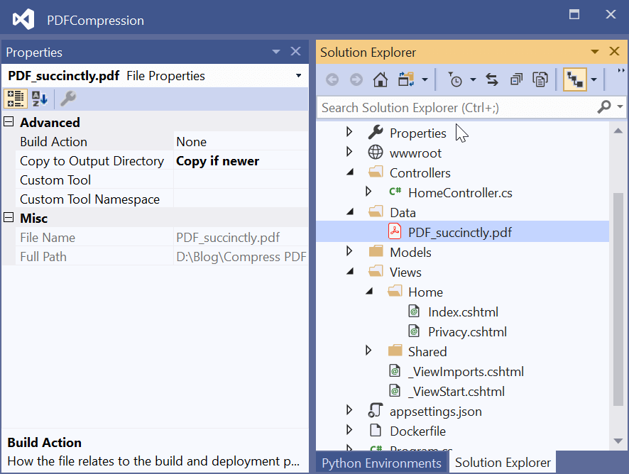 - Include the following code in the HomeController.cs file to compress the PDF document.