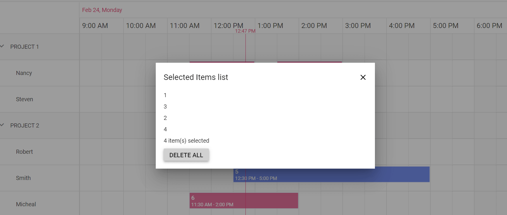 Once we have the selected items, we’ll display all of them in a dialog with a Delete All button. On mouse up, append the list of items into the dialog content. Then, if the user clicks the Delete All button, remove the selected items from the data and reassign the updated data to the Scheduler control.
