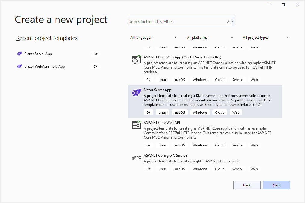 Follow these steps to easily create a Blazor server-side app in Visual Studio 2022: