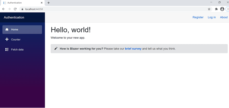 Step 5: Click the Create button to create the Blazor server-side application. Once the Blazor application is created, run the project. Now, click the Register button in the header section.