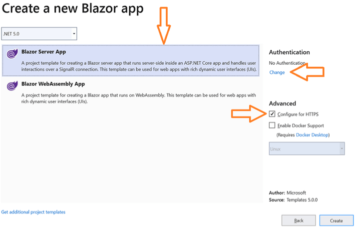 Step 3: Select Blazor Server App from the list. To enable authentication for the Blazor server-side app, select the Configure for HTTPS check box in the Advanced section. Then, click the Change link in the Authentication section.