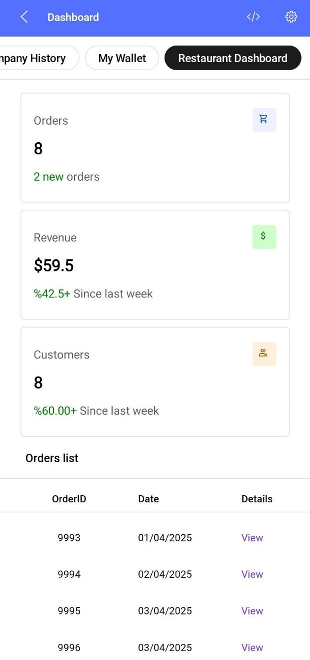 Monitor restaurant performance with views for daily revenue, active orders, and an order list ideal for business operations apps.