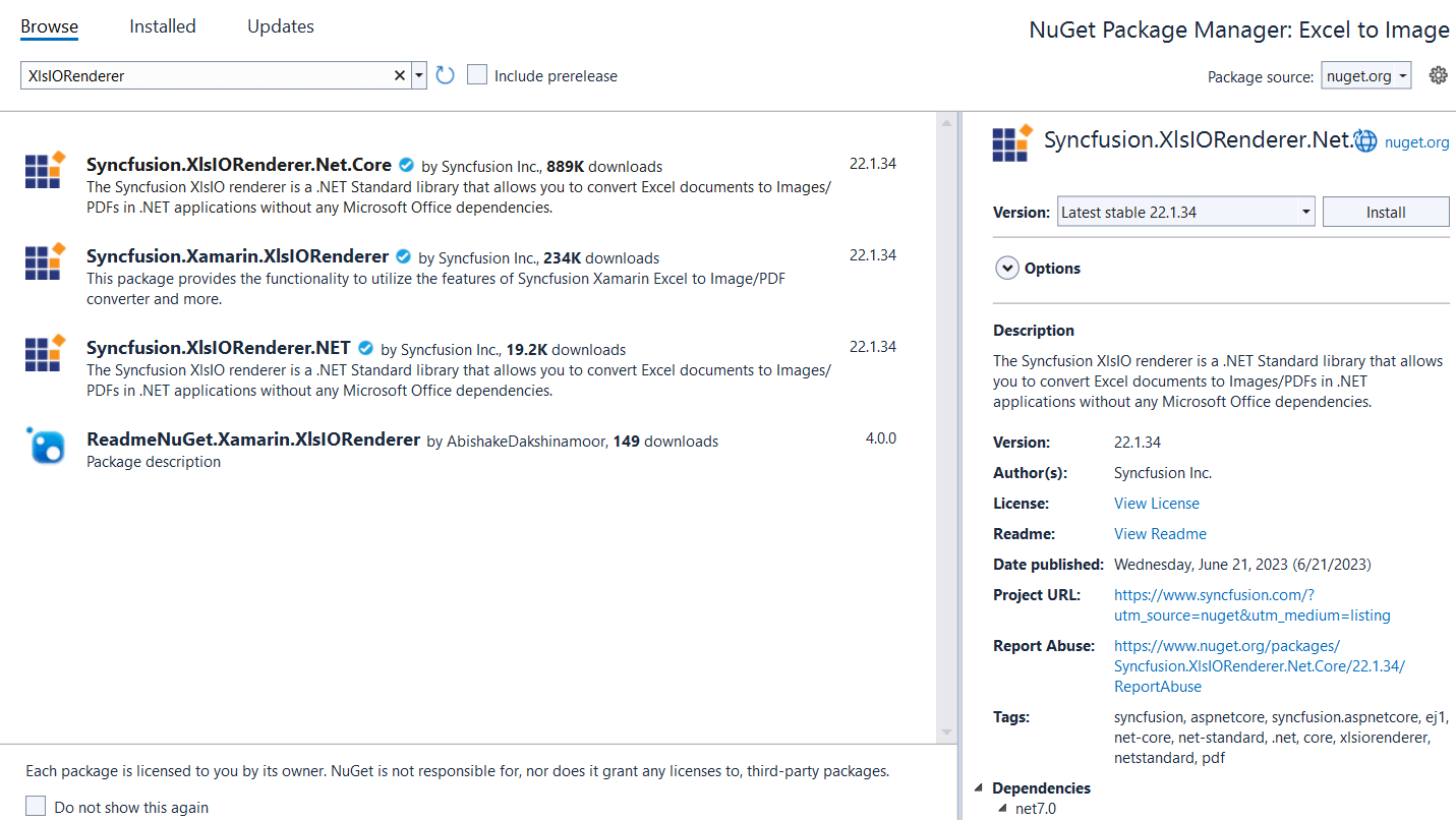 - Then, install the latest version of the Syncfusion.XlsIORenderer.Net.Core NuGet package.