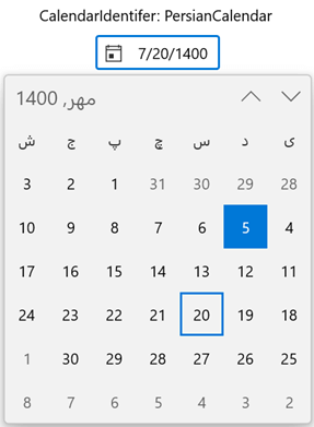 The Calendar Date Picker control supports a variety of calendars, including Hebrew, Persian, and others. Use the CalendarIdentifier property to modify the dropdown calendar type and the Language property to change the language. The editor will update the value in it based on the calendar type and the language applied.