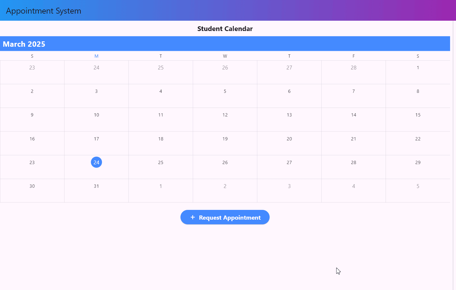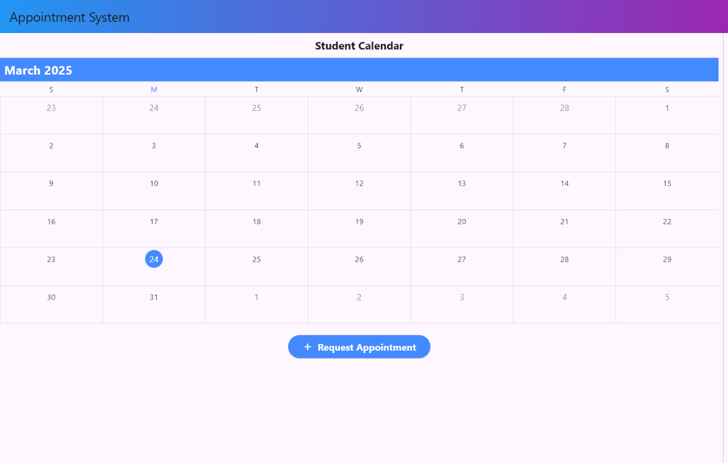 - Student Calendar: This calendar displays a blue header, highlights the current day, and includes a button to request an appointment.