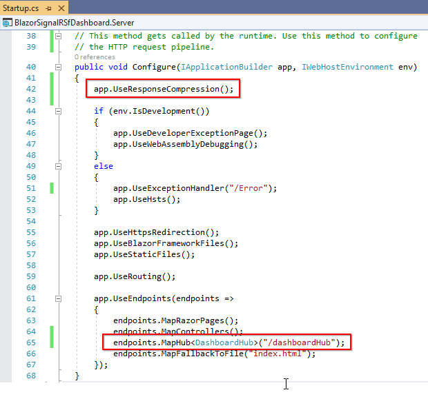 // This method gets called by the runtime. Use this method to add services to the container. // For more information on how to configure your application, visit https://go.microsoft.com/fwlink/?LinkID=398940 public void ConfigureServices(IServiceCollection services) { // Register the signalR service services.AddSignalR(); // Register the Syncfusion service services.AddSyncfusionBlazor(); services.AddResponseCompression(opts => { opts.MimeTypes = ResponseCompressionDefaults.MimeTypes.Concat( new[] { "application/octet-stream" }); }); services.AddControllersWithViews(); services.AddRazorPages(); } - In the Startup.Configure file, add the UseResponseCompression middleware at the top of the processing pipeline, and also add the hub endpoints at the bottom.Refer to the following screenshot.