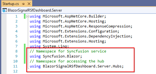 5. Add SignalR and ResponseCompression middleware services to the Startup.ConfigureServices file. Also, register the Syncfusion service as mentioned below.