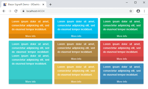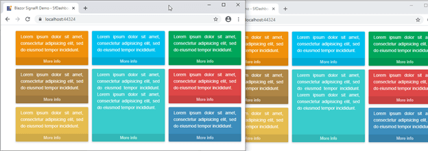 Explore Now@page "/" @using Syncfusion.Blazor.Layouts @inject NavigationManager NavigationManager @implements IDisposable <div class="container"> <SfDashboardLayout @ref="Dashboard" ID="dashboard" CellSpacing="@(new double[]{10 ,10 })" Columns="6"> <DashboardLayoutEvents OnDragStop="dragStop"></DashboardLayoutEvents> <DashboardLayoutPanels> <DashboardLayoutPanel SizeX="2" Row="0" Col="0" CssClass="e-orange"> <ContentTemplate> <div class="card"> <div class="card-content text"> Lorem ipsum dolor sit amet, consectetur adipisicing elit, sed do eiusmod tempor incididunt. </div> </div> <a class="footer" href="#"> More info </a> </ContentTemplate> </DashboardLayoutPanel> <DashboardLayoutPanel SizeX="2" Row="0" Col="2" CssClass="e-blue"> <ContentTemplate> <div class="card e-employee"> <div class="card-content text"> Lorem ipsum dolor sit amet, consectetur adipisicing elit, sed do eiusmod tempor incididunt. </div> </div> <a class="footer" href="#"> More info </a> </ContentTemplate> </DashboardLayoutPanel> <DashboardLayoutPanel SizeX="2" Row="0" Col="4" CssClass="e-green"> <ContentTemplate> <div class="card e-employee"> <div class="card-content text"> Lorem ipsum dolor sit amet, consectetur adipisicing elit, sed do eiusmod tempor incididunt. </div> </div> <a class="footer" href="#"> More info </a> </ContentTemplate> </DashboardLayoutPanel> <DashboardLayoutPanel SizeX="2" SizeY="2" Row="1" Col="0" CssClass="e-seablue"> <ContentTemplate> <div class="card e-employee"> <div class="card-content text"> Lorem ipsum dolor sit amet, consectetur adipisicing elit, sed do eiusmod tempor incididunt. Lorem ipsum dolor sit amet, consectetur adipisicing elit, sed do eiusmod tempor incididunt. </div> </div> <a class="footer" href="#"> More info </a> </ContentTemplate> </DashboardLayoutPanel> <DashboardLayoutPanel SizeX="2" Row="1" Col="2" CssClass="e-yellow"> <ContentTemplate> <div class="card e-employee"> <div class="card-content text"> Lorem ipsum dolor sit amet, consectetur adipisicing elit, sed do eiusmod tempor incididunt. </div> </div> <a class="footer" href="#"> More info </a> </ContentTemplate> </DashboardLayoutPanel> <DashboardLayoutPanel SizeX="2" Row="1" Col="4" CssClass="e-cyan"> <ContentTemplate> <div class="card e-employee"> <div class="card-content text"> Lorem ipsum dolor sit amet, consectetur adipisicing elit, sed do eiusmod tempor incididunt. </div> </div> <a class="footer" href="#"> More info </a> </ContentTemplate> </DashboardLayoutPanel> <DashboardLayoutPanel SizeX="2" Row="2" Col="2" CssClass="e-sandal"> <ContentTemplate> <div class="card e-employee"> <div class="card-content text"> Lorem ipsum dolor sit amet, consectetur adipisicing elit, sed do eiusmod tempor incididunt. </div> </div> <a class="footer" href="#"> More info </a> </ContentTemplate> </DashboardLayoutPanel> <DashboardLayoutPanel SizeX="2" Row="2" Col="4" CssClass="e-voilet"> <ContentTemplate> <div class="card e-employee"> <div class="card-content text"> Lorem ipsum dolor sit amet, consectetur adipisicing elit, sed do eiusmod tempor incididunt. </div> </div> <a class="footer" href="#"> More info </a> </ContentTemplate> </DashboardLayoutPanel> </DashboardLayoutPanels> </SfDashboardLayout> </div> @code{ SfDashboardLayout Dashboard; HubConnection Connection; private string id; private int row; private int col; protected override async Task OnInitializedAsync() { // Create a Hub connection. Connection = new HubConnectionBuilder().WithUrl(NavigationManager.ToAbsoluteUri("/DashboardHub")).Build(); // Detect the client event from server side. Connection.On<string, int, int>("LayoutChange", OnLayoutChange); await Connection.StartAsync(); } public async Task dragStop(DragStopArgs args) { // Fetch the corresponding drag element. var id = args.Element.ID; // Get the current dashboard layout panel position using Serialize() method var value = await this.Dashboard.Serialize(); for (int i = 0; i < value.Count; i++) { if (value[i].Id == args.Element.ID) { // Assign the corresponding row and column based on id after drag completion. row = value[i].Row; col = value[i].Col; } } // Call the dashboard method inside the Hub. await Connection.InvokeAsync("DashbordDragandDrop", id, row, col); } Task OnLayoutChange(string id, int row, int column) { // Call the movepanel method to assign the exact position to the panel after dragging. this.Dashboard.MovePanel(id, row, column); return Task.CompletedTask; } public void Dispose() { _ = Connection.DisposeAsync(); } } <style> .card-content.text { font-size: 14px; text-align: justify; color: #fff; padding: 8px 16px; } .card { border: none; background-color: inherit; position: relative; } #dashboard .e-panel.e-blue { background-color: #00c0ef; } #dashboard .e-panel.e-green { background-color: #00a65a; } #dashboard .e-panel.e-yellow { background-color: #af8646; } #dashboard .e-panel.e-orange { background-color: #f0910c; } #dashboard .e-panel.e-red { background-color: #dd4b39; } #dashboard .e-panel.e-voilet { background-color: #3c8dbc; } #dashboard .e-panel.e-seablue { background-color: #39CCCC; } #dashboard .e-panel.e-sandal { background-color: #e6bd50; } #dashboard .e-panel.e-cyan { background-color: #de4747; } .container .footer { position: absolute; font-size: 13px; bottom: 0px; text-align: center; padding: 3px 0; color: rgba(255,255,255,0.8); display: block; z-index: 10; background: rgba(0,0,0,0.1); text-decoration: none; width: 100%; } .container { width: 800px; margin: 0; } @@media(max-width:600px) { .container { flex: 1; width: auto; } } </style> - Add the Syncfusion style sheet in the index.html page’s head section.