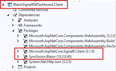 - The server project configuration is now completed. Let’s configure the client project. Install the NuGet packages Microsoft.AspNetCore.SignalR.Client and Syncfusion.Blazor in the client project.