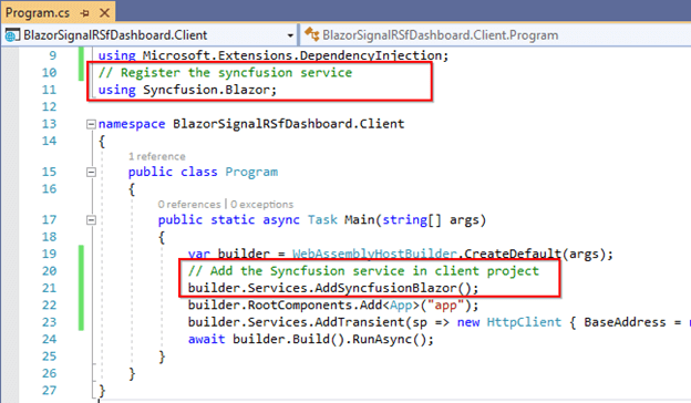 - Then, integrate the Syncfusion service in the program.cs file for Syncfusion component deployment.