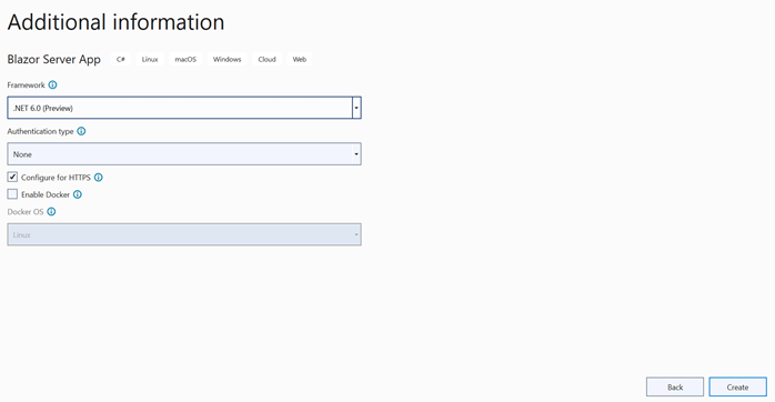 - The Additional information dialog will open. Select .Net 6.0 as the target framework. The Configure for HTTPS checkbox will be selected by default when creating a new project. Then, click Create.