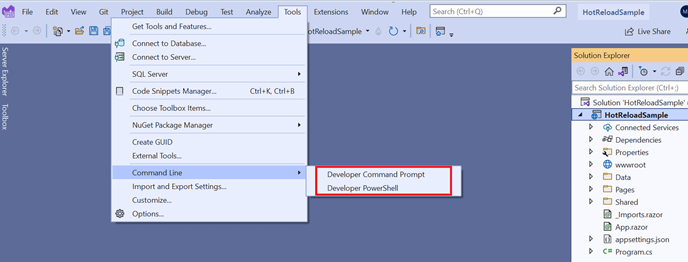- First, open Visual Studio. Then, navigate to Tools -> Command Line -> Developer Command Prompt (or) Tools -> Command Line -> Developer PowerShell.