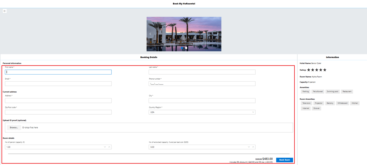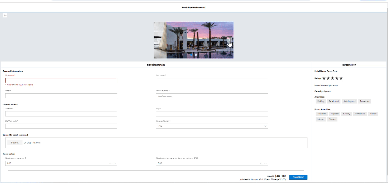 In this section, we’ve employed the React Form Validator to ensure the collection of mandatory user details for room bookings. Within the form, we’ve integrated the following React components to gather user information: