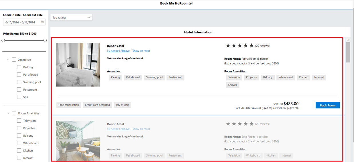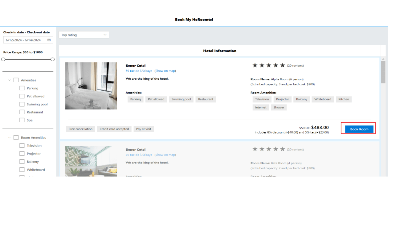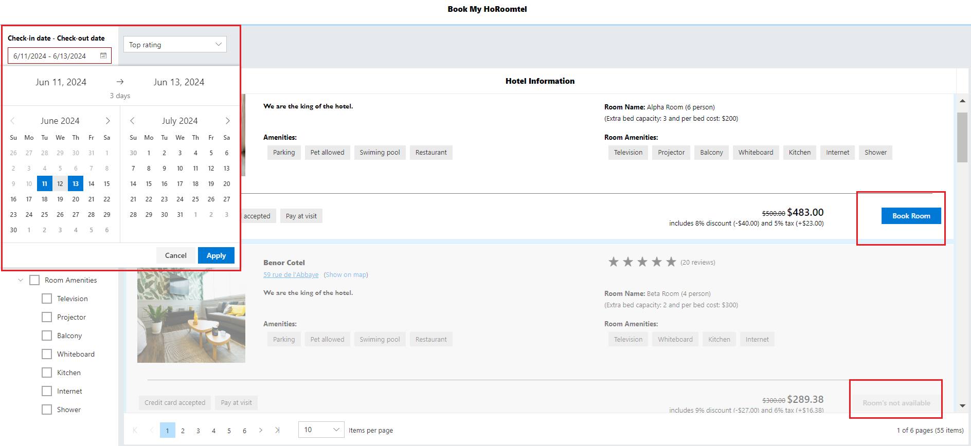 The DataGrid showcases rooms with an enabled Book Room button if they are available on your chosen dates. Conversely, the Book Room button is disabled if they are unavailable.