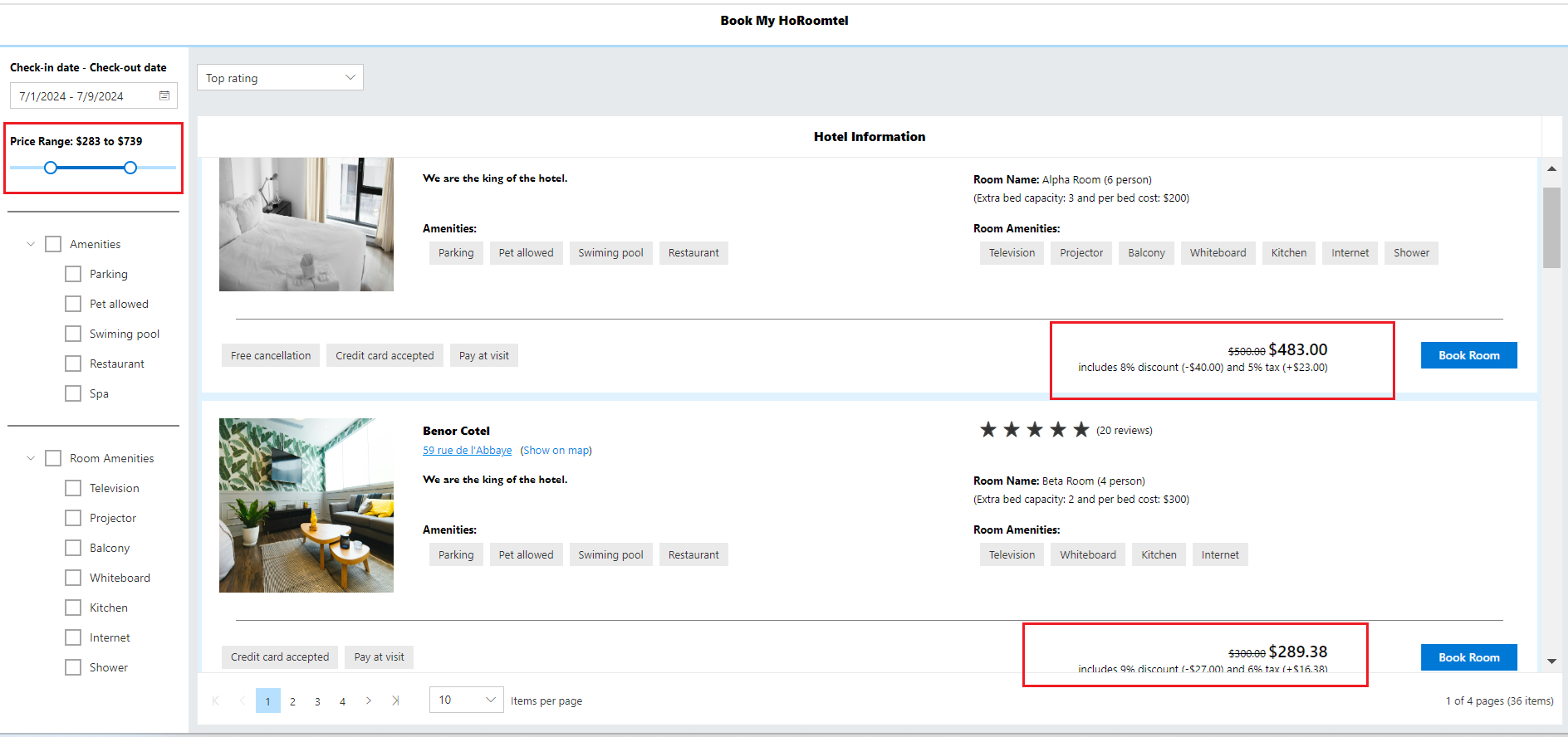 Now, use the React Slider component to choose rooms within your budget, allowing you to set minimum and maximum prices. Once you’ve set the price range, the DataManager initiates the filtering process to display available rooms in the Data Grid within the specified price range.