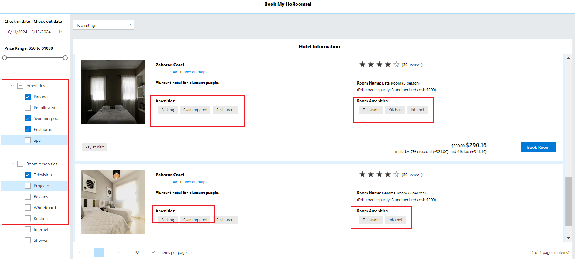 Then, employ the React TreeView to display hotels and room amenities. After selecting your preferred amenities, the DataManager starts the filtering process to display available rooms in the Data Grid within the specified price range.