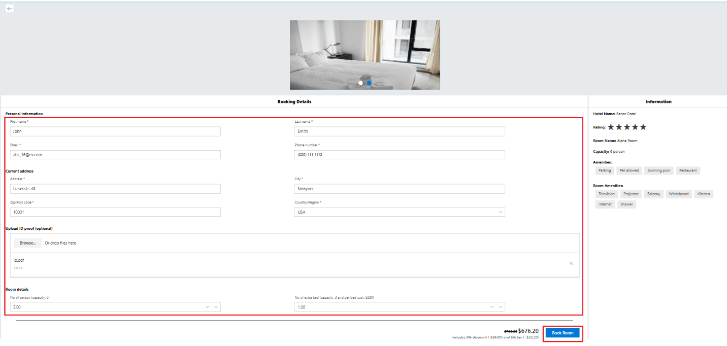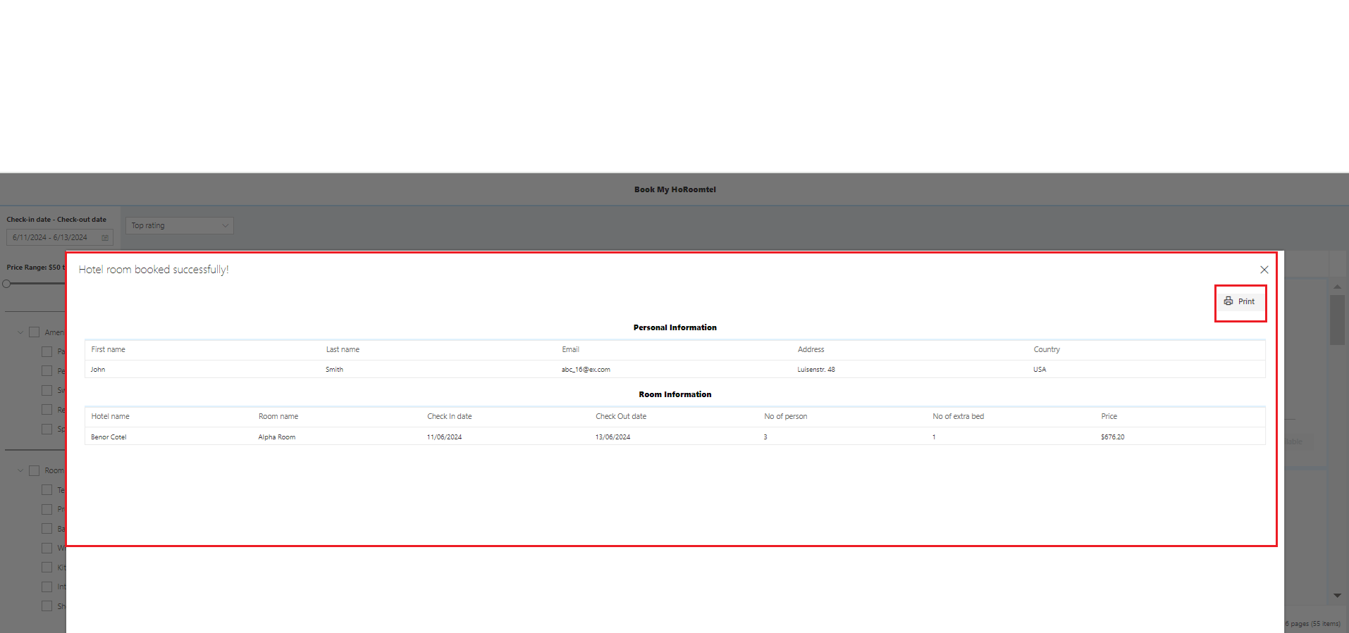 This section explains the booking confirmation process and how to print the booking receipt. After filling in all the mandatory details, select the Book Room button.Â