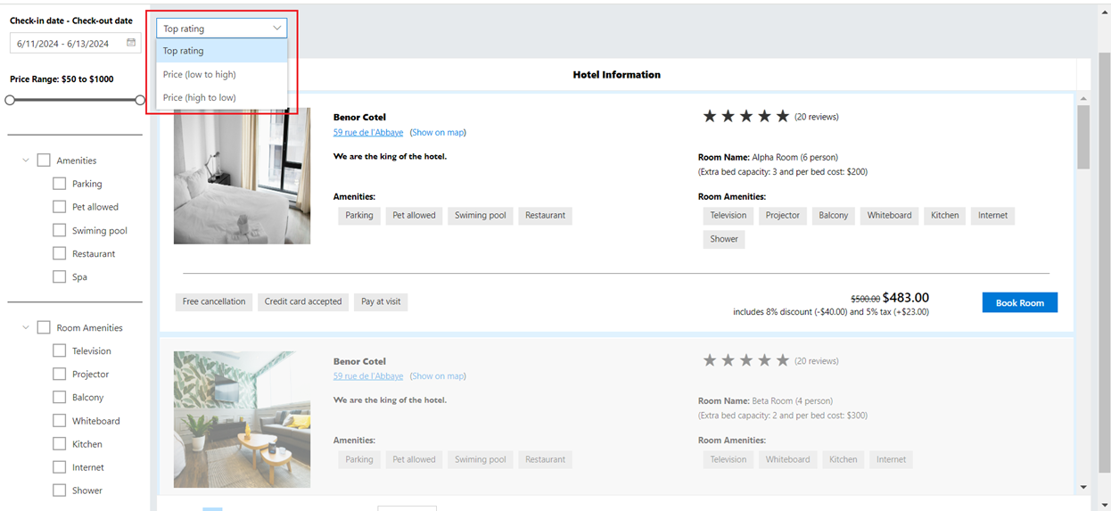 Depending on the user’s selection, we can sort the hotel room data using the DataManager’s sorting feature, with the results displayed in the Data Grid.