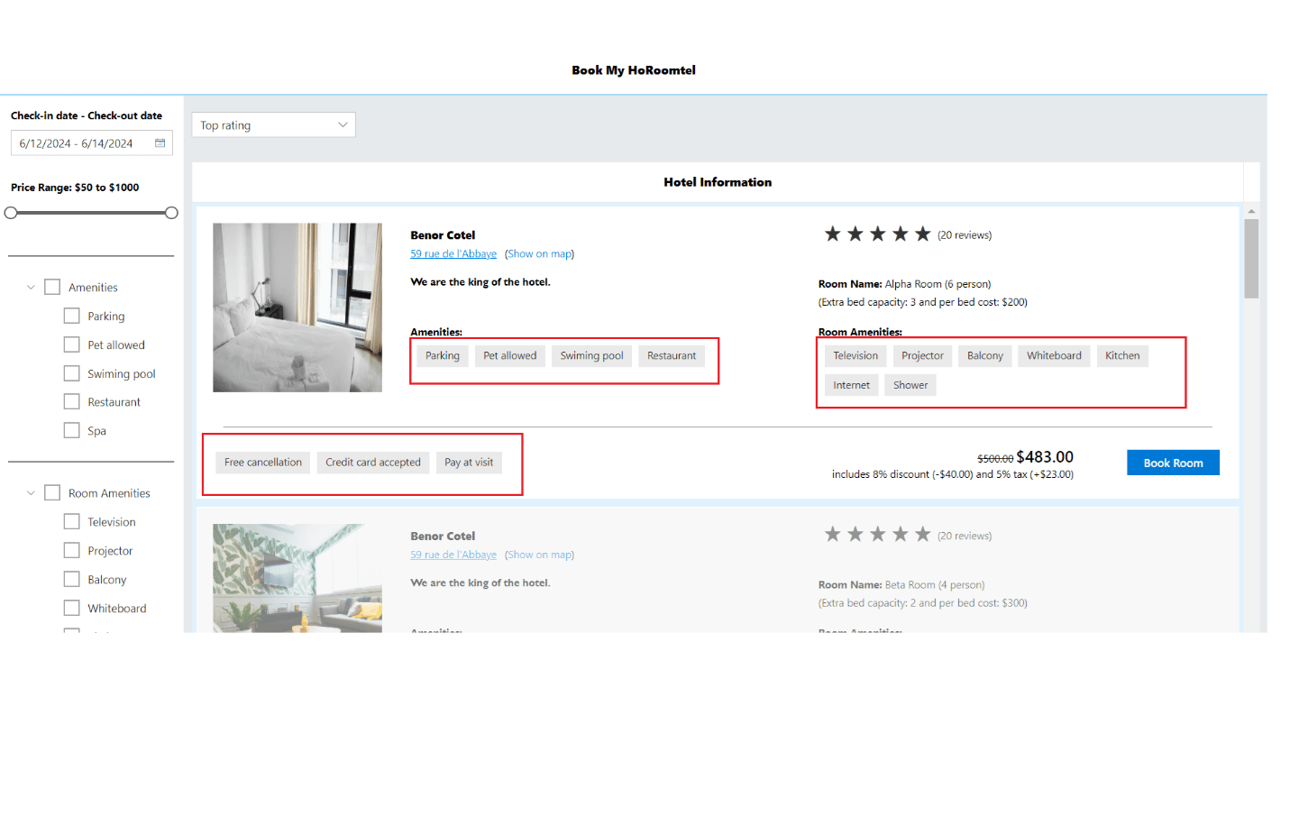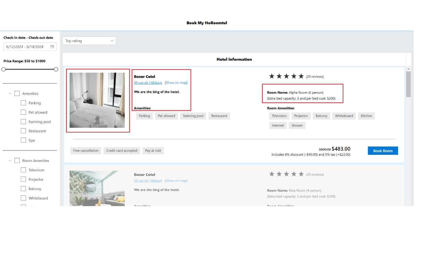 - Provide options to select a hotel based on available rooms for selected check-in and check-out dates, budget, facilities, and user reviews.