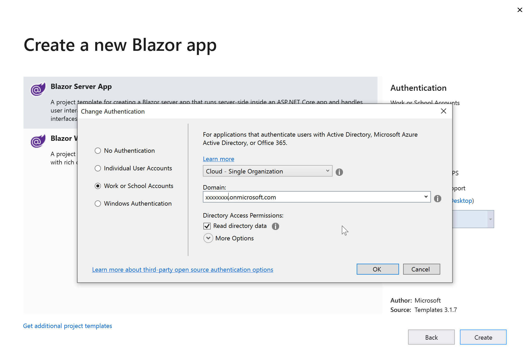 - Choose Blazor Server App and select the Change option from the Authentication section to configure the domain.
