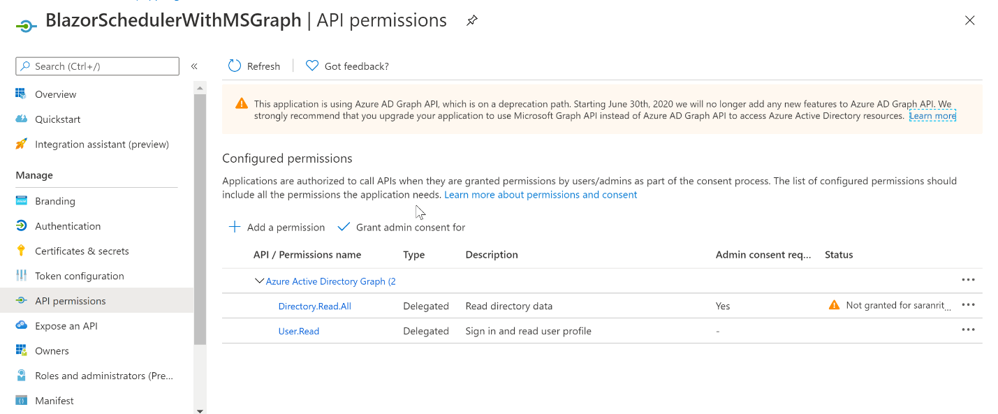 - Enable the permission by confirming Grant admin consent for XXXXXX, like in the following screenshot.